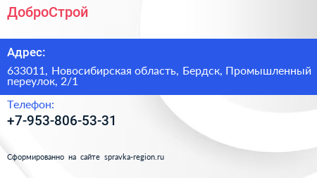 ДоброСтрой по адресу 633011, Новосибирская область, Бердск, Промышленный переулок, 2/1 в дальнейшем Организация, размещена в следующих категориях: