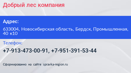 Добрый лес, компания по адресу 633004, Новосибирская область, Бердск, Промышленная, 40 к10 в дальнейшем Организация, размещена в следующих категориях: