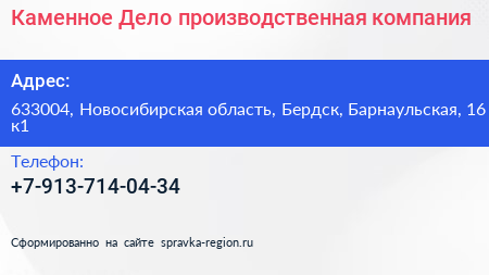 Каменное Дело, производственная компания по адресу 633004, Новосибирская область, Бердск, Барнаульская, 16 к1 в дальнейшем Организация, размещена в следующих категориях: