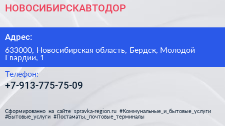 НОВОСИБИРСКАВТОДОР по адресу 633000, Новосибирская область, Бердск, Молодой Гвардии, 1 в дальнейшем Организация, размещена в следующих категориях: