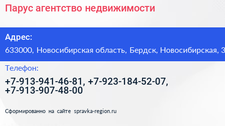 Парус, агентство недвижимости по адресу 633000, Новосибирская область, Бердск, Новосибирская, 3 в дальнейшем Организация, размещена в следующих категориях: