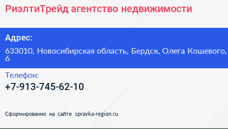 РиэлтиТрейд, агентство недвижимости по адресу 633010, Новосибирская область, Бердск, Олега Кошевого, 6 в дальнейшем Организация, размещена в следующих категориях: