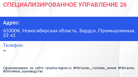 СПЕЦИАЛИЗИРОВАННОЕ УПРАВЛЕНИЕ №26 по адресу 633004, Новосибирская область, Бердск, Промышленная, 22 к1 в дальнейшем Организация, размещена в следующих категориях: