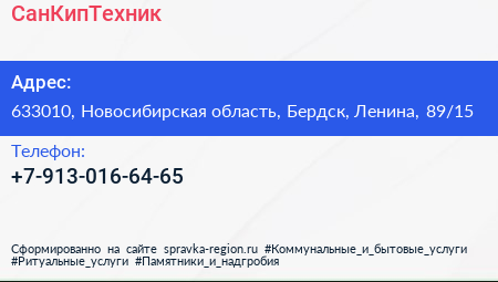 СанКипТехник по адресу 633010, Новосибирская область, Бердск, Ленина, 89/15 в дальнейшем Организация, размещена в следующих категориях: