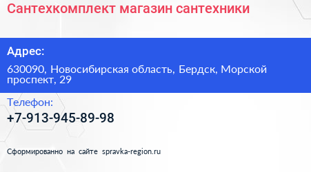 Сантехкомплект, магазин сантехники по адресу 630090, Новосибирская область, Бердск, Морской проспект, 29 в дальнейшем Организация, размещена в следующих категориях: