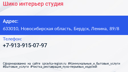 Шико, интерьер-студия по адресу 633010, Новосибирская область, Бердск, Ленина, 89/8 в дальнейшем Организация, размещена в следующих категориях: