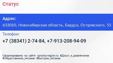 Статус по адресу 633010, Новосибирская область, Бердск, Островского, 55 в дальнейшем Организация, размещена в следующих категориях: