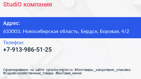 StudiO, компания по адресу 633003, Новосибирская область, Бердск, Боровая, 4/2 в дальнейшем Организация, размещена в следующих категориях:
