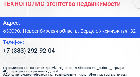 ТЕХНОПОЛИС, агентство недвижимости по адресу 630090, Новосибирская область, Бердск, Жемчужная, 32 в дальнейшем Организация, размещена в следующих категориях: