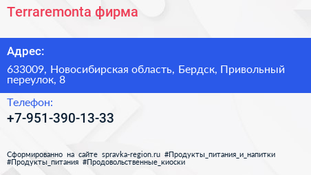 Terraremonta, фирма по адресу 633009, Новосибирская область, Бердск, Привольный переулок, 8 в дальнейшем Организация, размещена в следующих категориях: