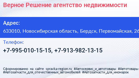 Верное Решение, агентство недвижимости по адресу 633010, Новосибирская область, Бердск, Первомайская, 26 в дальнейшем Организация, размещена в следующих категориях: