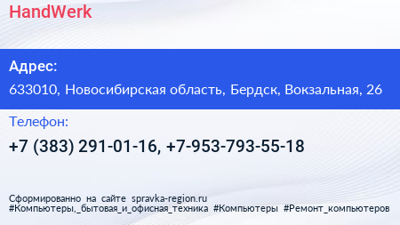 HandWerk по адресу 633010, Новосибирская область, Бердск, Вокзальная, 26 в дальнейшем Организация, размещена в следующих категориях: