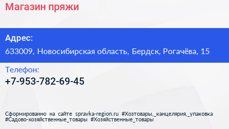 Магазин пряжи по адресу 633009, Новосибирская область, Бердск, Рогачёва, 15 в дальнейшем Организация, размещена в следующих категориях: