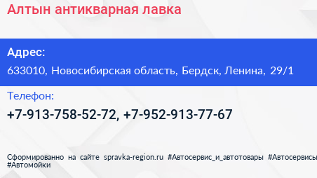 Алтын, антикварная лавка по адресу 633010, Новосибирская область, Бердск, Ленина, 29/1 в дальнейшем Организация, размещена в следующих категориях: