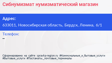 Сибнумизмат, нумизматический магазин по адресу 633011, Новосибирская область, Бердск, Ленина, 6/1 в дальнейшем Организация, размещена в следующих категориях:
