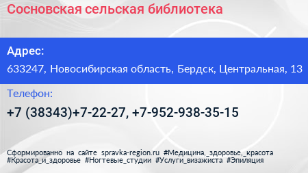 Сосновская сельская библиотека по адресу 633247, Новосибирская область, Бердск, Центральная, 13 в дальнейшем Организация, размещена в следующих категориях: