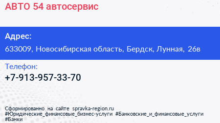 АВТО-54, автосервис по адресу 633009, Новосибирская область, Бердск, Лунная, 26в в дальнейшем Организация, размещена в следующих категориях: