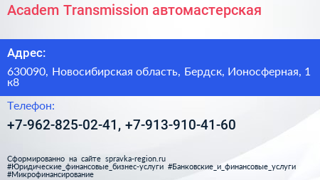 Academ Transmission, автомастерская по адресу 630090, Новосибирская область, Бердск, Ионосферная, 1 к8 в дальнейшем Организация, размещена в следующих категориях: