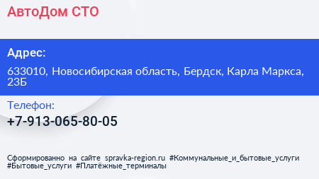 АвтоДом, СТО по адресу 633010, Новосибирская область, Бердск, Карла Маркса, 23Б в дальнейшем Организация, размещена в следующих категориях: