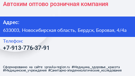 Автохим, оптово-розничная компания по адресу 633003, Новосибирская область, Бердск, Боровая, 4/4а в дальнейшем Организация, размещена в следующих категориях:
