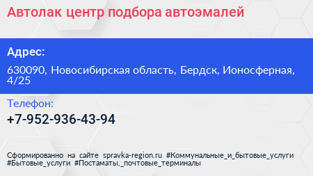 Автолак, центр подбора автоэмалей по адресу 630090, Новосибирская область, Бердск, Ионосферная, 4/25 в дальнейшем Организация, размещена в следующих категориях: