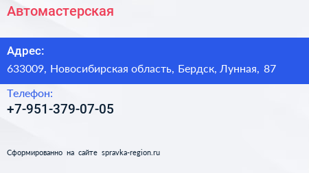 Автомастерская по адресу 633009, Новосибирская область, Бердск, Лунная, 87 в дальнейшем Организация, размещена в следующих категориях: