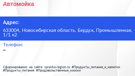 Автомойка по адресу 633004, Новосибирская область, Бердск, Промышленная, 1/1 к2 в дальнейшем Организация, размещена в следующих категориях: