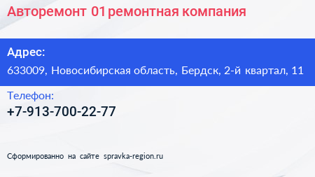 Авторемонт-01, ремонтная компания по адресу 633009, Новосибирская область, Бердск, 2-й квартал, 11 в дальнейшем Организация, размещена в следующих категориях: