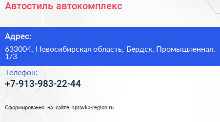 Автостиль, автокомплекс по адресу 633004, Новосибирская область, Бердск, Промышленная, 1/3 в дальнейшем Организация, размещена в следующих категориях: