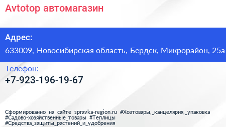 Avtotop, автомагазин по адресу 633009, Новосибирская область, Бердск, Микрорайон, 25а в дальнейшем Организация, размещена в следующих категориях: