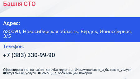 Башня, СТО по адресу 630090, Новосибирская область, Бердск, Ионосферная, 3/5 в дальнейшем Организация, размещена в следующих категориях: