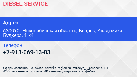 DIESEL SERVICE по адресу 630090, Новосибирская область, Бердск, Академика Будкера, 1 к4 в дальнейшем Организация, размещена в следующих категориях: