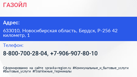 ГАЗОЙЛ по адресу 633010, Новосибирская область, Бердск, Р-256 42 километр, 1 в дальнейшем Организация, размещена в следующих категориях: