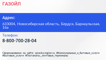 ГАЗОЙЛ по адресу 633004, Новосибирская область, Бердск, Барнаульская, 16а в дальнейшем Организация, размещена в следующих категориях: