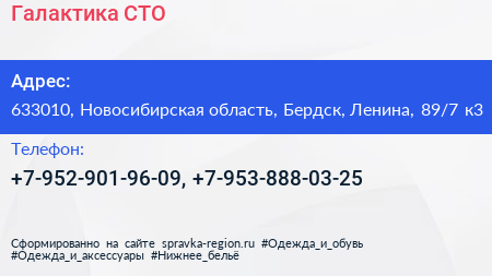 Галактика, СТО по адресу 633010, Новосибирская область, Бердск, Ленина, 89/7 к3 в дальнейшем Организация, размещена в следующих категориях: