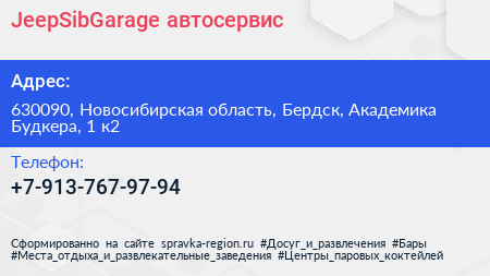JeepSibGarage, автосервис по адресу 630090, Новосибирская область, Бердск, Академика Будкера, 1 к2 в дальнейшем Организация, размещена в следующих категориях: