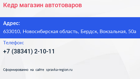 Кедр, магазин автотоваров по адресу 633010, Новосибирская область, Бердск, Вокзальная, 50а в дальнейшем Организация, размещена в следующих категориях: