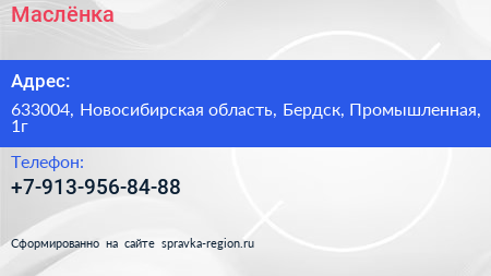 Маслёнка по адресу 633004, Новосибирская область, Бердск, Промышленная, 1г в дальнейшем Организация, размещена в следующих категориях: