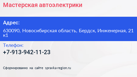 Мастерская автоэлектрики по адресу 630090, Новосибирская область, Бердск, Инженерная, 21 к1 в дальнейшем Организация, размещена в следующих категориях:
