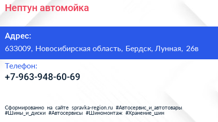 Нептун, автомойка по адресу 633009, Новосибирская область, Бердск, Лунная, 26в в дальнейшем Организация, размещена в следующих категориях: