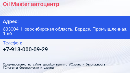 Oil Master, автоцентр по адресу 633004, Новосибирская область, Бердск, Промышленная, 1 к6 в дальнейшем Организация, размещена в следующих категориях: