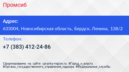 Промсиб по адресу 633004, Новосибирская область, Бердск, Ленина, 138/2 в дальнейшем Организация, размещена в следующих категориях: