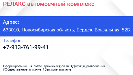 РЕЛАКС, автомоечный комплекс по адресу 633010, Новосибирская область, Бердск, Вокзальная, 52Б в дальнейшем Организация, размещена в следующих категориях: