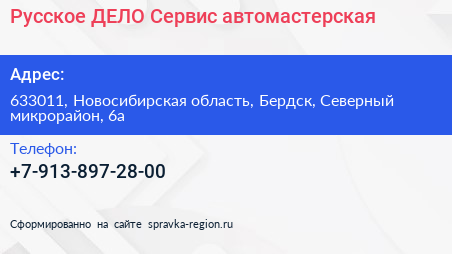Русское ДЕЛО Сервис, автомастерская по адресу 633011, Новосибирская область, Бердск, Северный микрорайон, 6а в дальнейшем Организация, размещена в следующих категориях: