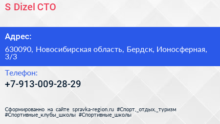 S-Dizel, СТО по адресу 630090, Новосибирская область, Бердск, Ионосферная, 3/3 в дальнейшем Организация, размещена в следующих категориях: