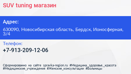 SUV-tuning, магазин по адресу 630090, Новосибирская область, Бердск, Ионосферная, 3/4 в дальнейшем Организация, размещена в следующих категориях: