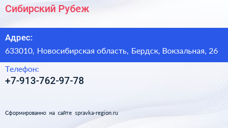 Сибирский Рубеж по адресу 633010, Новосибирская область, Бердск, Вокзальная, 26 в дальнейшем Организация, размещена в следующих категориях: