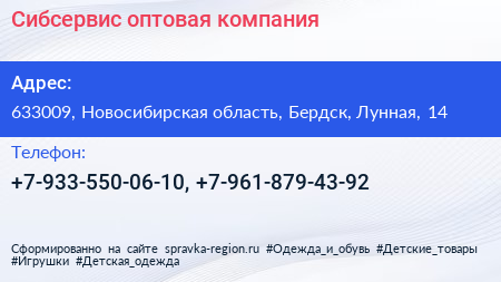 Сибсервис, оптовая компания по адресу 633009, Новосибирская область, Бердск, Лунная, 14 в дальнейшем Организация, размещена в следующих категориях: