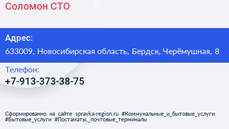 Соломон, СТО по адресу 633009, Новосибирская область, Бердск, Черёмушная, 8 в дальнейшем Организация, размещена в следующих категориях: