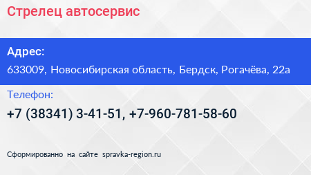 Стрелец, автосервис по адресу 633009, Новосибирская область, Бердск, Рогачёва, 22а в дальнейшем Организация, размещена в следующих категориях:
